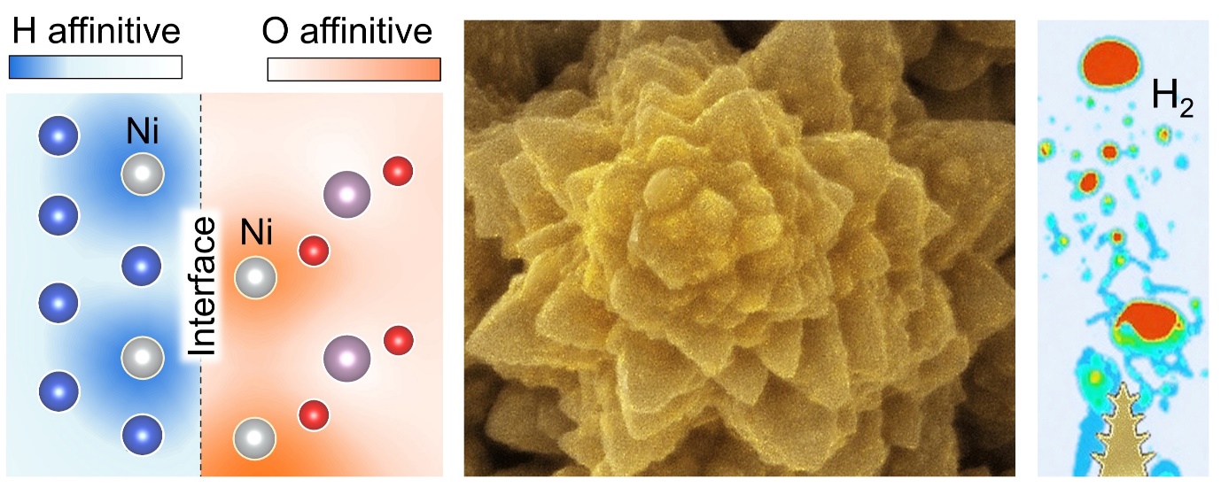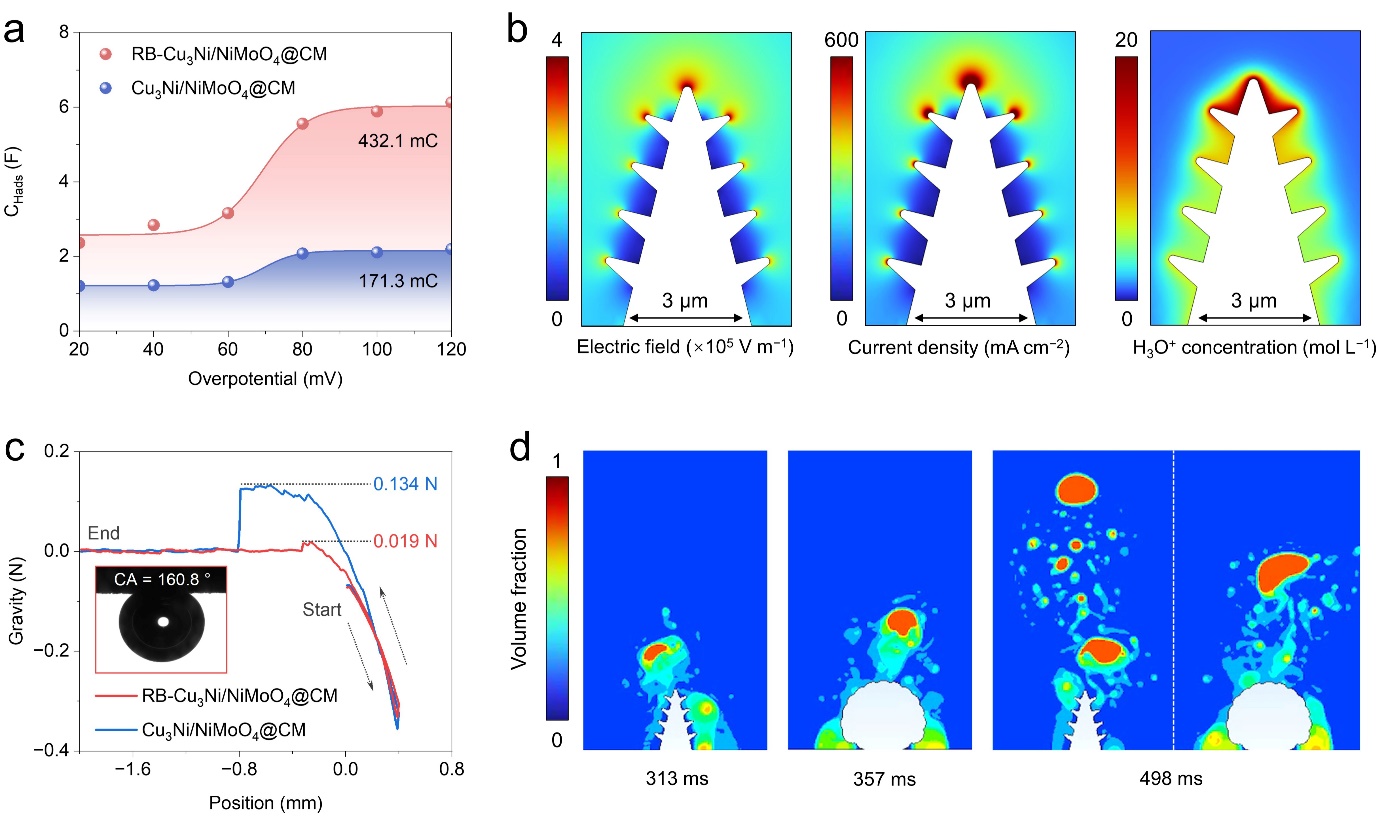 近年来,冼海珍教授与吕玉珍教授团队联合周苇教授,深入开展了高效碱性电解水用非贵金属催化材料的开发研究。该项研究通过设计合成出一种具有分形尖端结构的高导电性 Cu3Ni/NiMoO4异质结构电极,通过多维度协同作用实现了碱性电解水的高效析氢性能。通过Cu3Ni/NiMoO4异质结构中合金组分提供亲氢特性,氧化物则发挥亲氧作用,二者协同强化水分子在界面处的水解离过程,为析氢反应提供充足质子源;利用独特的分形尖端结构,不仅构建了局部强电场和富集质子,同时加速气泡释放。该催化材料实现了氢气从催化剂表面的高效解吸与释放,避免了气泡在电极表面聚集形成物理阻挡层,提高了反应物种与催化剂活性位点的有效接触,而且大降低了加界面欧姆电阻,提高了反应效率。此外,避免了剧烈的气体逸出而产生的机械应力,保障了电极结构的大电流稳定性。这些发现为设计高效、稳定的工业制氢电极提供了新的思路和策略,有望推动电解水制氢技术的进一步发展和应用。