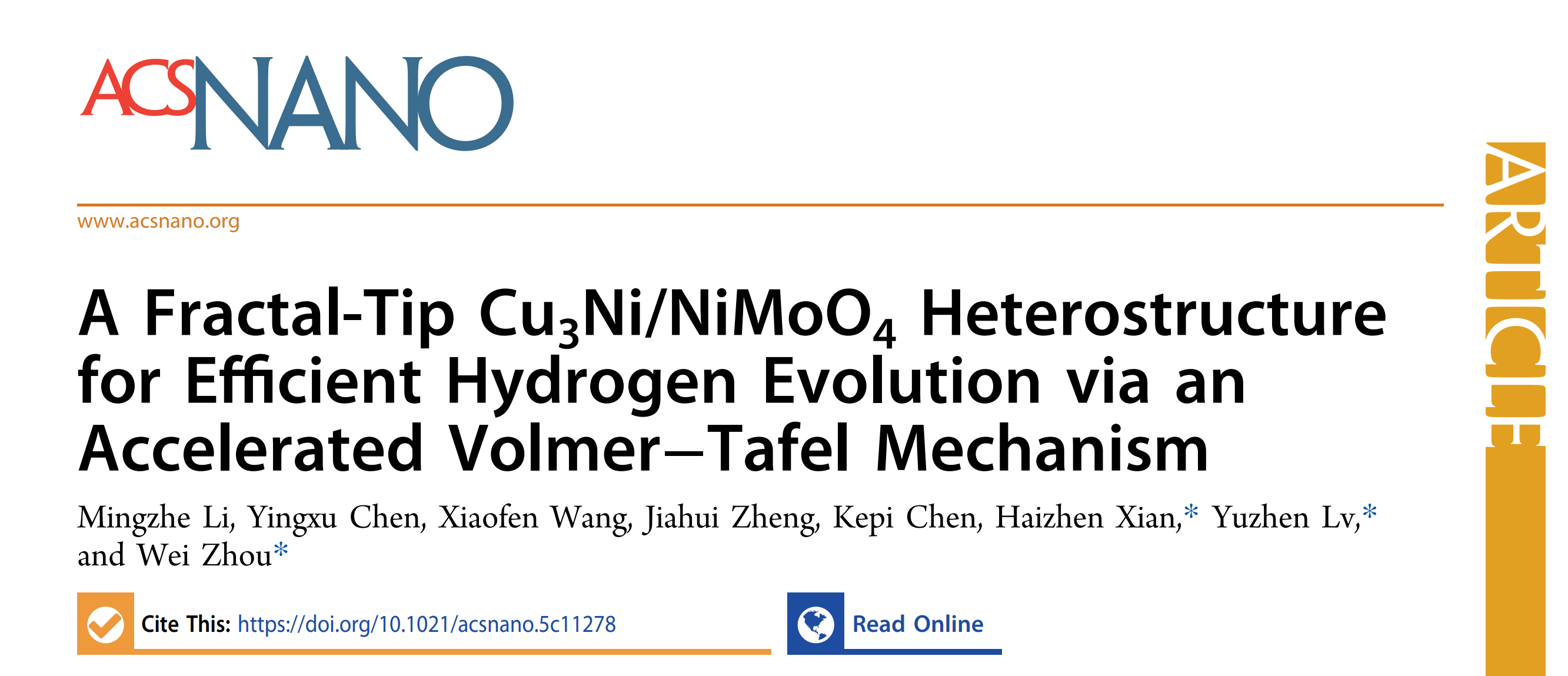 近日,18禁漫画 吕玉珍教授、冼海珍教授与北京航空航天大学的周苇教授合作在非贵金属催化碱性电解水制氢研究中取得重要突破。研究团队在国际知名期刊《ACS Nano》上发表了题为“A Fractal-Tip Cu3Ni/NiMoO4 Heterostructure for Efficient Hydrogen Evolution via an Accelerated Volmer−Tafel Mechanism”的研究论文,华北电力大学为第一完成单位。冼海珍教授、吕玉珍教授和周苇教授为共同通讯作者,18禁漫画 博士研究生李明哲、陈盈旭为第一和第二作者。
