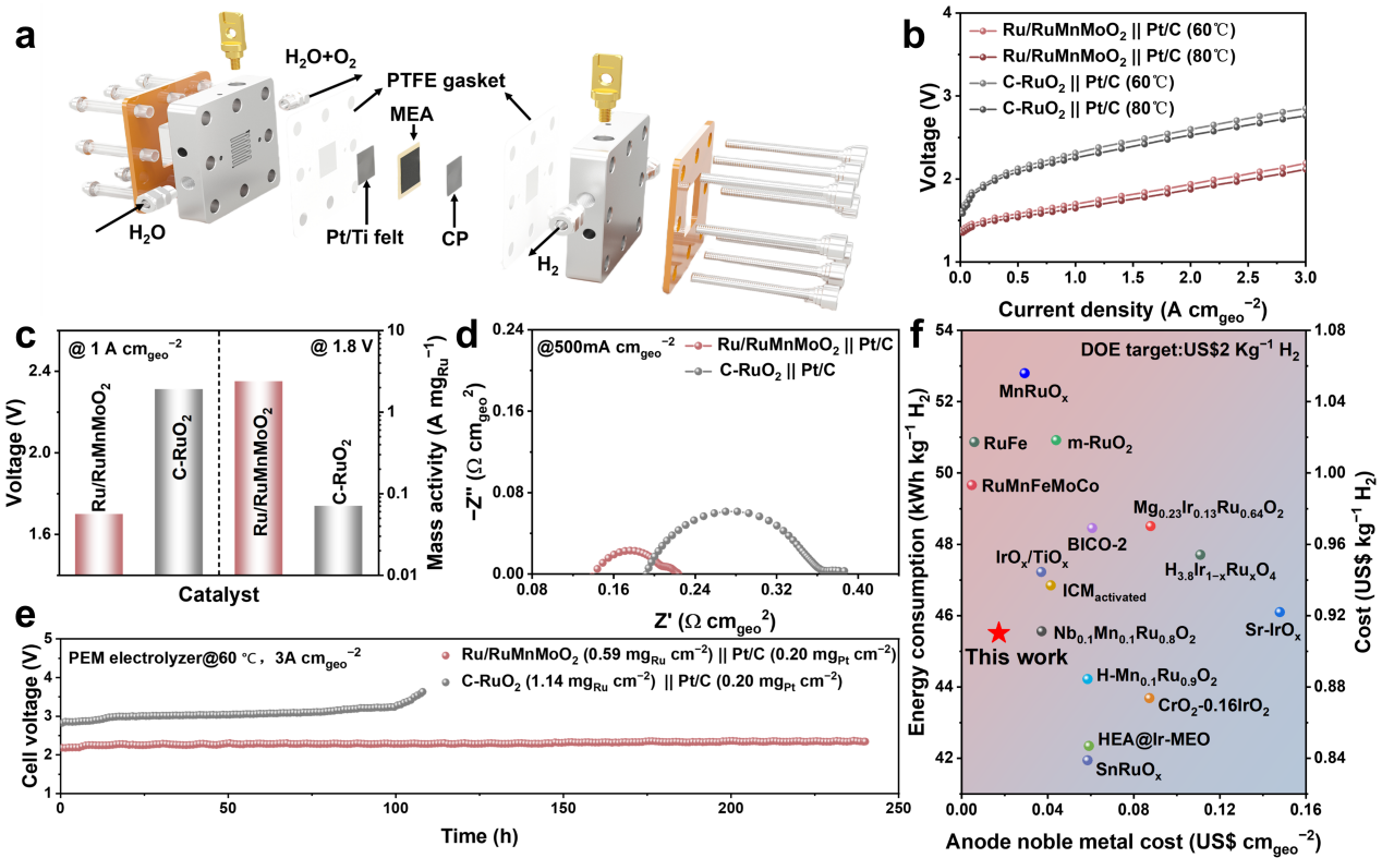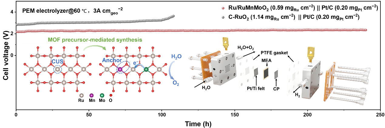 本研究提出一种创新的金属-有机框架前驱体介导策略,成功合成了Ru/RuMnMoO2异质结构催化剂。研究结果表明,Mn元素的加入可有效稳定晶格氧,Mo元素则能显著促进电子向钌活性位点迁移,进而抑制过氧化物诱导的钌溶出现象。该催化剂在酸性电解液体系下,10 mA·cm−2的电流密度仅需163 mV过电位,且能维持3000 h以上的长周期稳定性。值得关注的是,以Ru/RuMnMoO2为阳极组装的质子交换膜电解槽,在钌载量仅为0.59 mg cm−2的条件下,于1.70 V电压下即可实现1.0 A·cm−2的电流密度。此外,该电解槽可在3 A·cm−2的高电流密度下稳定持续运行240 h,充分证明其在降低电解水制氢对铱资源依赖方面具备极高的实际应用价值与推广潜力。