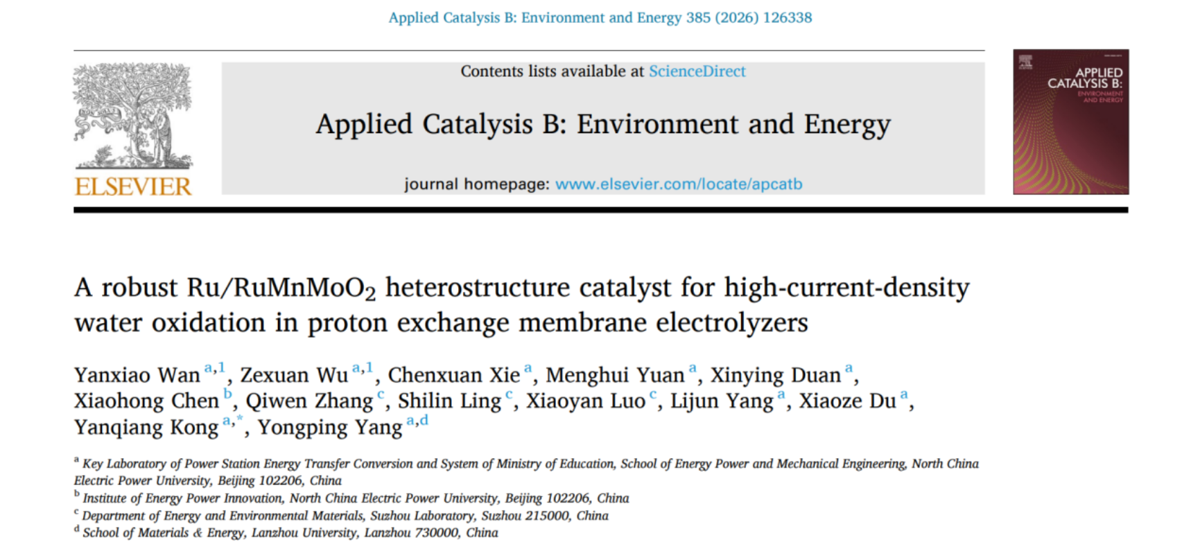 近日,华北电力大学孔艳强副教授在《Applied Catalysis B: Environment and Energy》期刊在线发表了题为“A robust Ru/RuMnMoO2 heterostructure catalyst for high-current-density water oxidation in proton exchange membrane electrolyzers”的研究论文,华北电力大学为论文第一完成单位,18禁漫画 硕士研究生万延笑、博士研究生吴泽轩为第一作者,孔艳强为通讯作者。该研究工作得到了国家自然科学基金的资助。